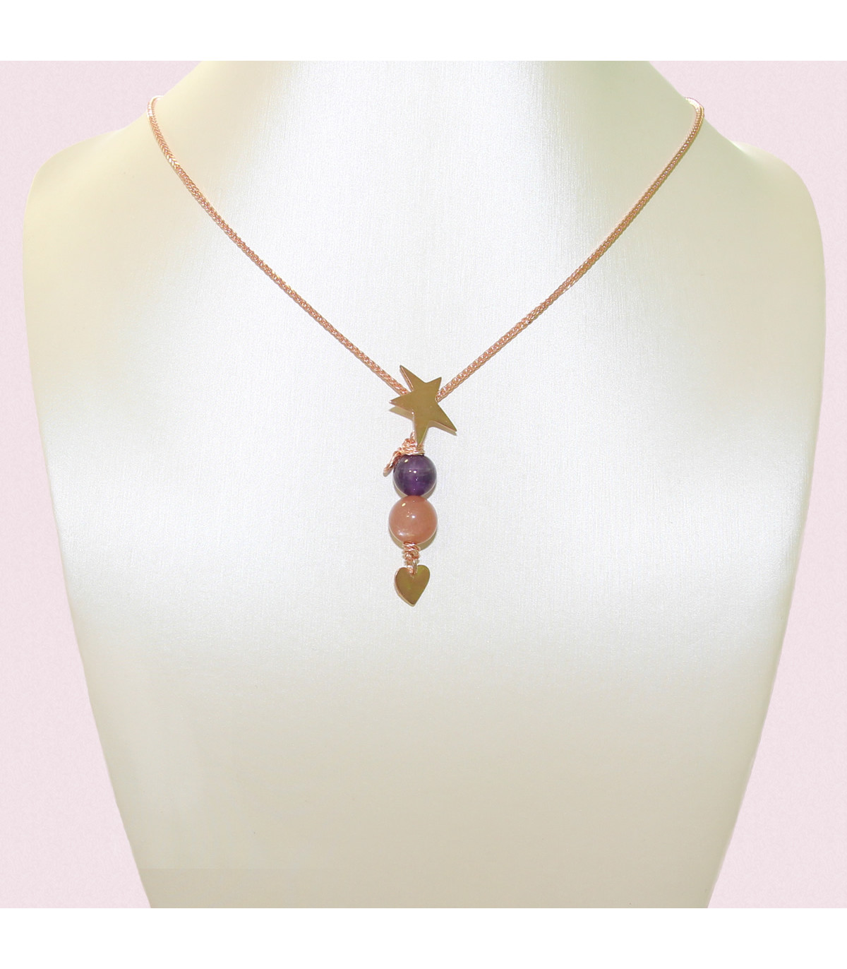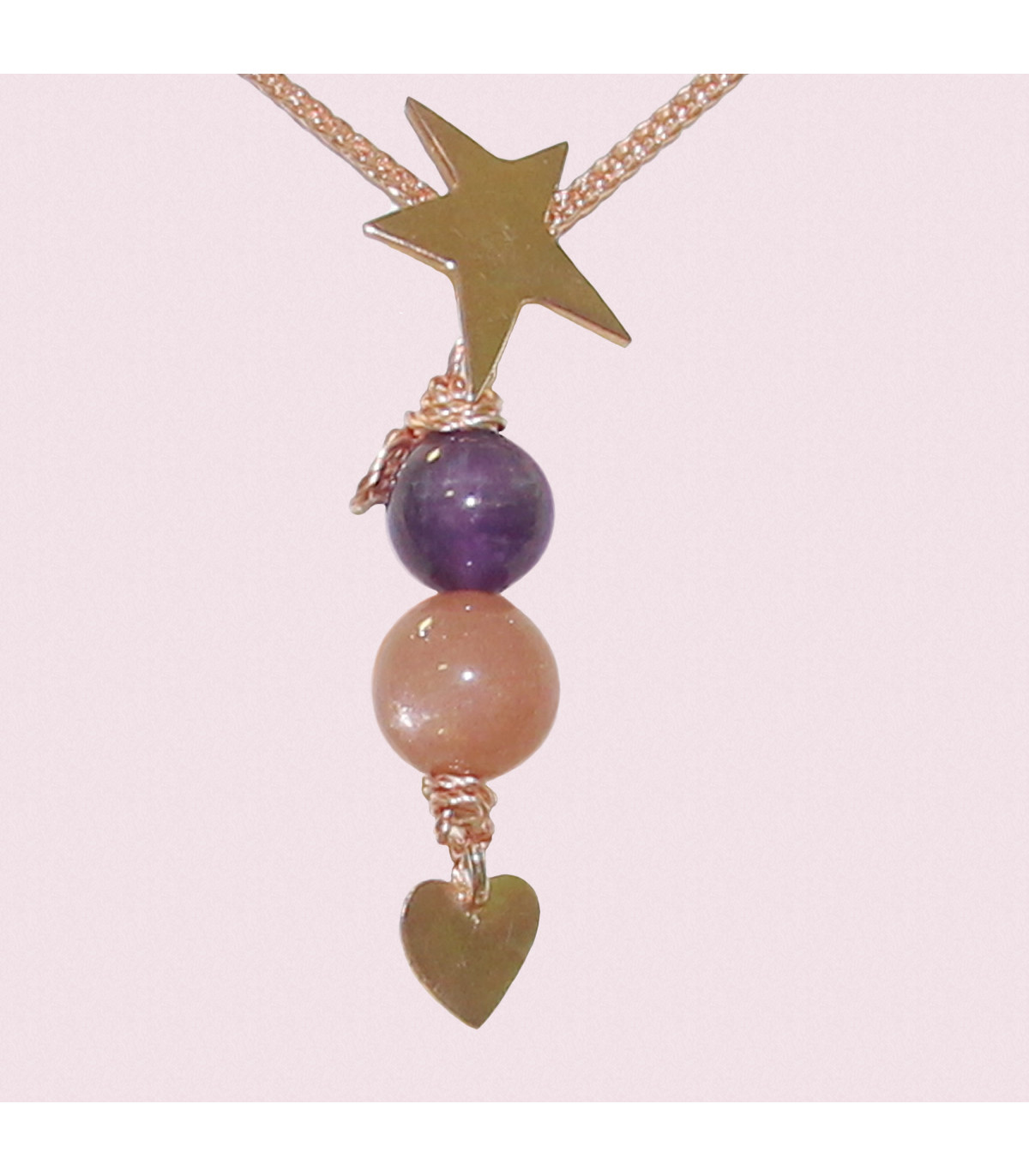 Paired with an amethyst and orange moonstone crystal connected to a star spark and a mini heart design (both are rose-gold plated over 925 silver), crafted with artistic craft wires. Pendant is also attached to an 18 inch rose-gold plated over silver necklace chain. This is a handcrafted jewellery piece; every crystal bead can be unique, the colour and look may vary due to photography over the web and materials used, subject to the rose-gold plated design, the casted silver piece may not be perfectly finished.